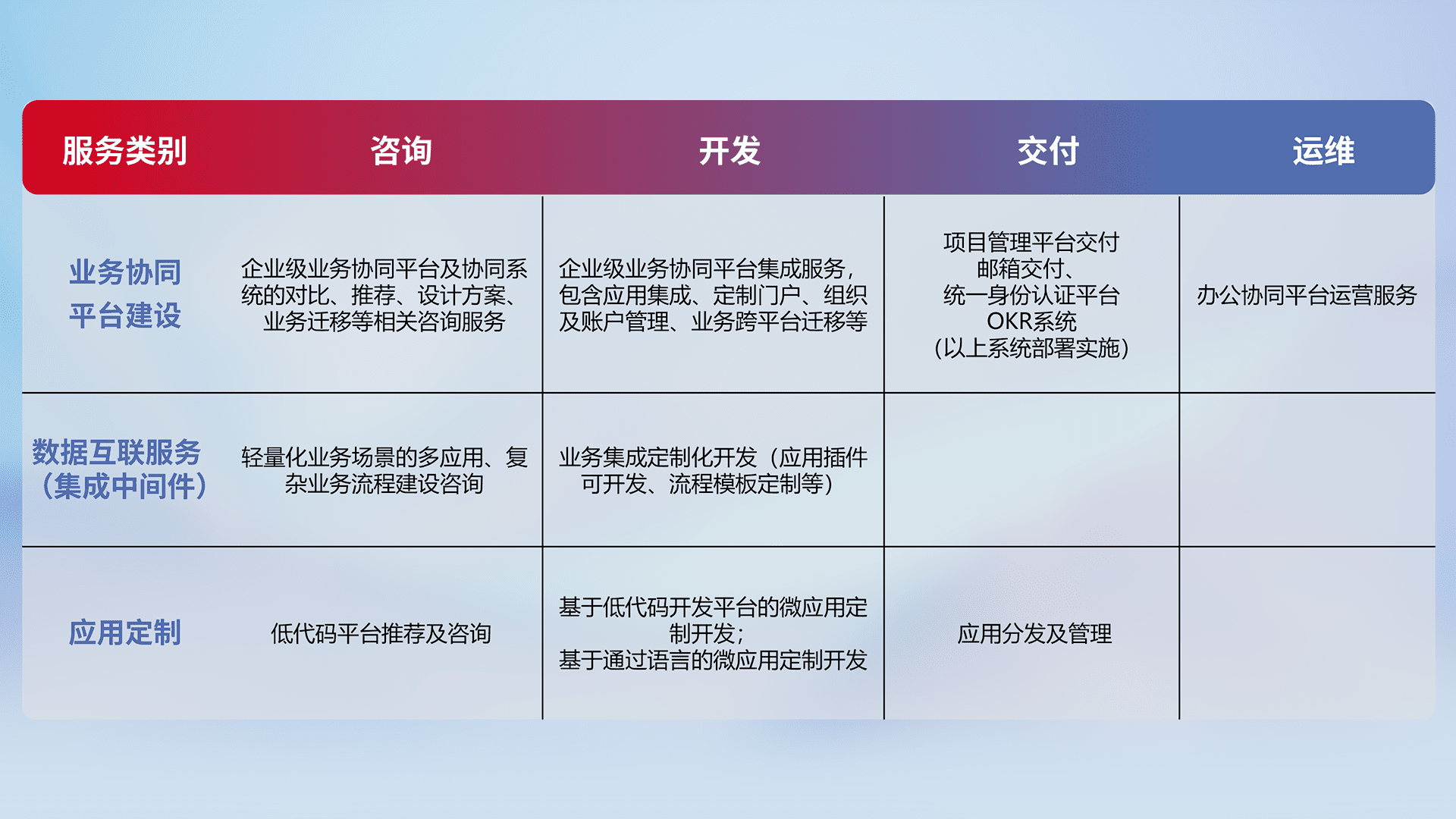 针对钉钉、、、、企微、、、IDaas等平台级产品提供产品的规划、、、、方案、、、、交付、、定制化开发等服务,,,实现如统一协同办公、、、智能客户服务、、、、混合会议管理、、智能数据查询、、、、等业务场景,,实现数字化转型。。。